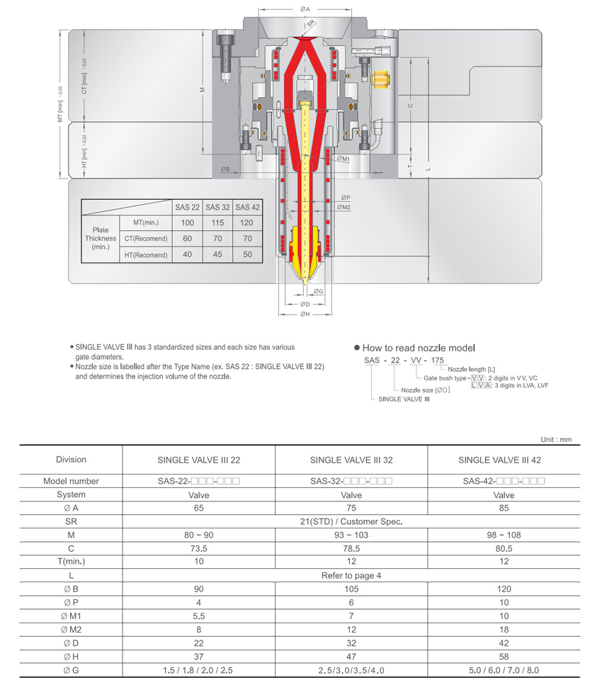 Line of single nozzles with a pneumatic valve. Single valve is used for large-sized products with a single injection point. Valve pin provides an ideal footprint and optimal injection parameters. Single valve can be used with cooling bushes.